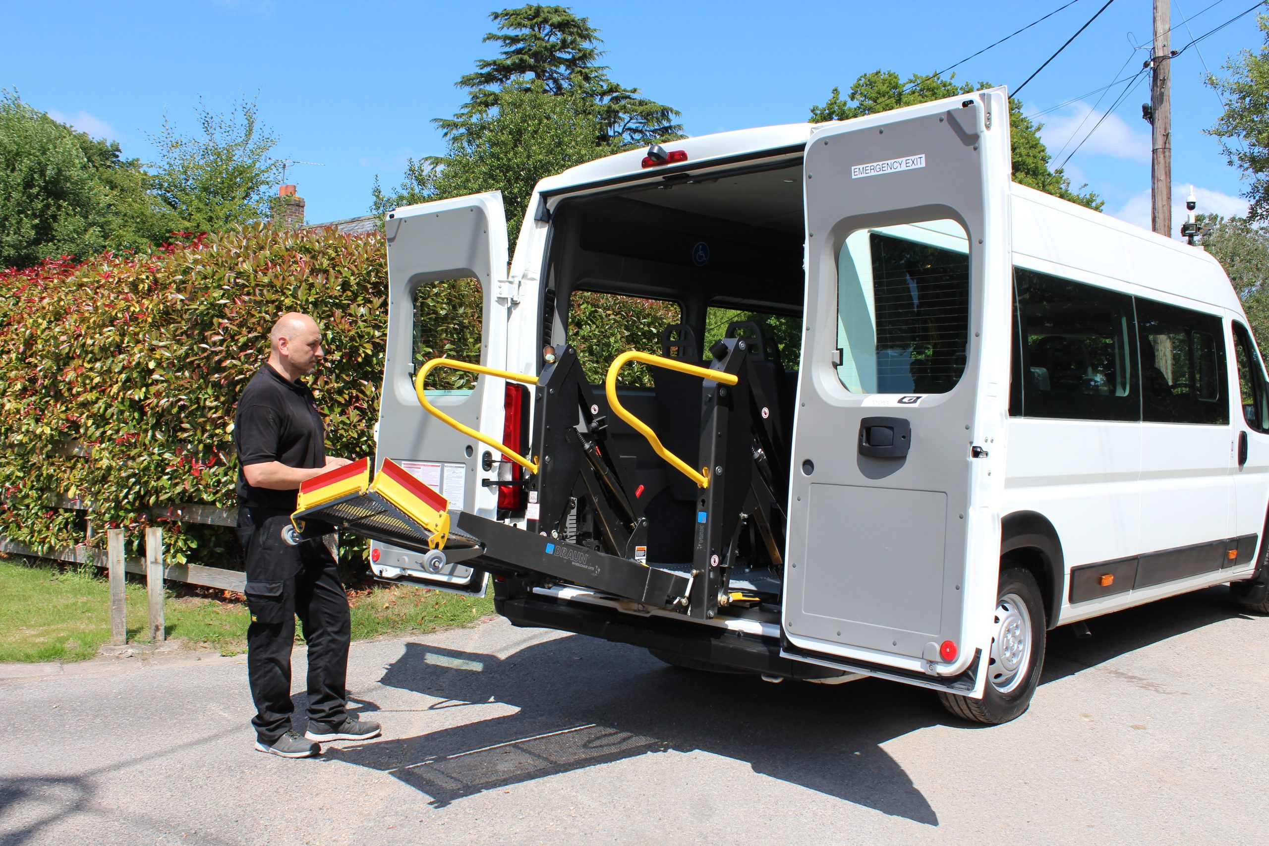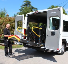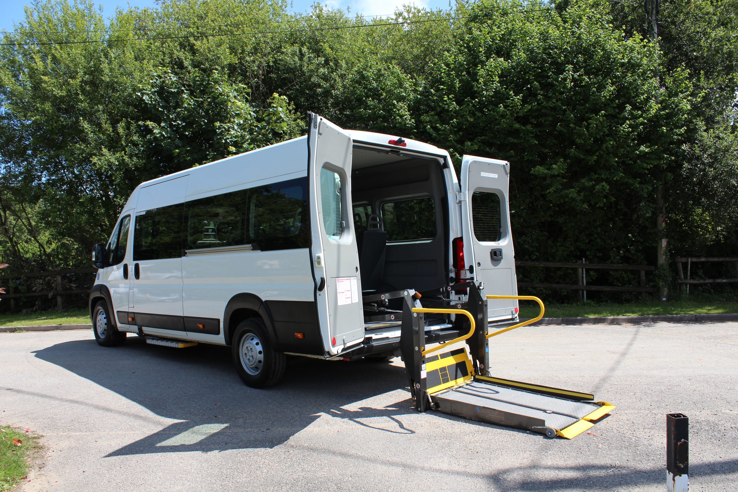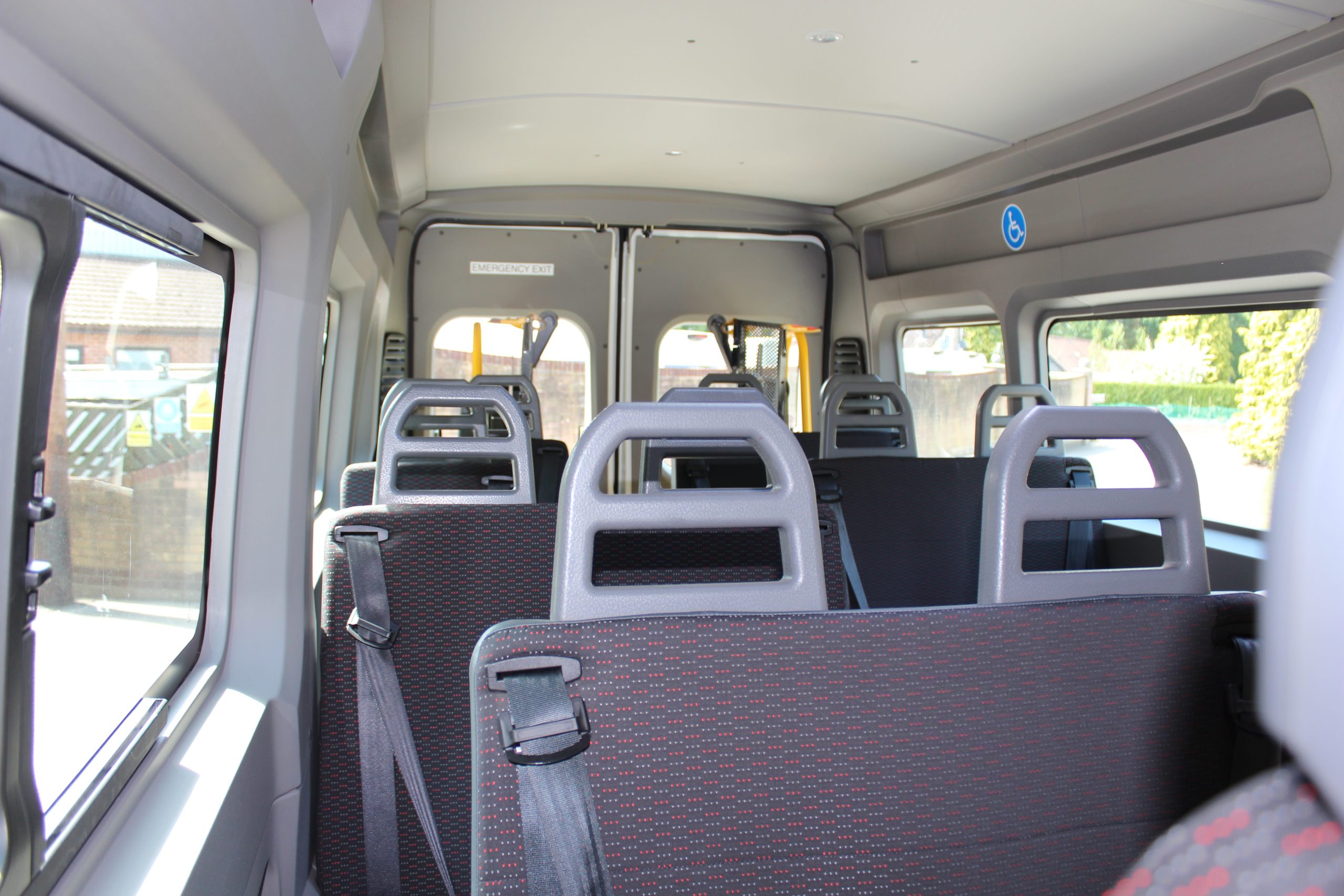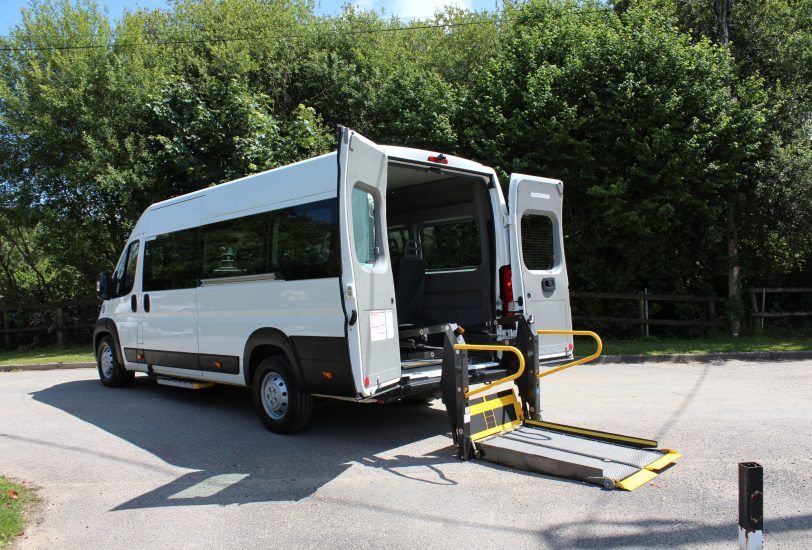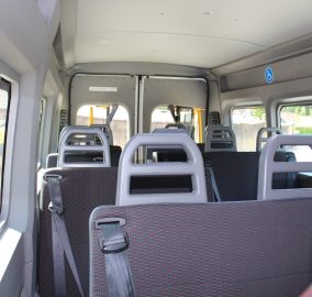19 Reg. 14 Seats. This vehicle features an internal electric wheelchair lift and a versatile tracked floor system and can carry up to 3 wheelchairs.